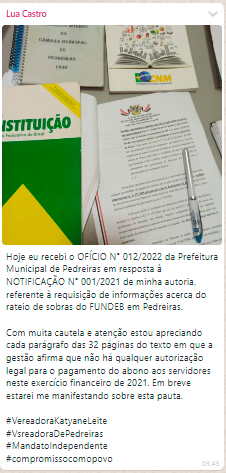 "Hoje eu recebi o OFÍCIO N° 012/2022 da Prefeitura Municipal de Pedreiras em resposta à NOTIFICAÇÃO N° 001/2021 de minha autoria, referente à requisição de informações acerca do rateio de sobras do FUNDEB em Pedreiras.